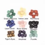 Red jasper, Tiger eye, Rose quartz, Amethyst, Carline, Black turmoline, selenite, clear quartz, yellow Aventurine, Rohdocrosite